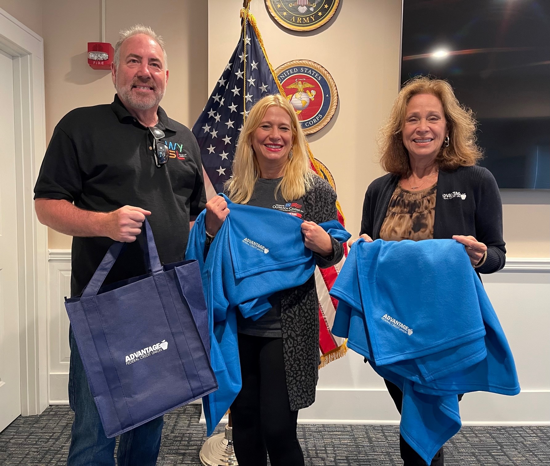 Advantage made the 13WHAM Bright Spot after presenting *50 blankets for 50 veterans in need* to Veterans Outreach Center in recognition of their 50th anniversary. Since 1973, Veterans Outreach Center has improved the lives of veterans and their families by offering a variety of free services. The VOC’s residential facilities, Richards House and Otto House, are able to accommodate over 50 residents while providing case management care in a safe setting. The presentation and blanket donation was coordinated by Veterans Outreach Center board member Senator Joe Robach. Advantage Federal Credit Union wishes to thank all veterans for their service to our country.