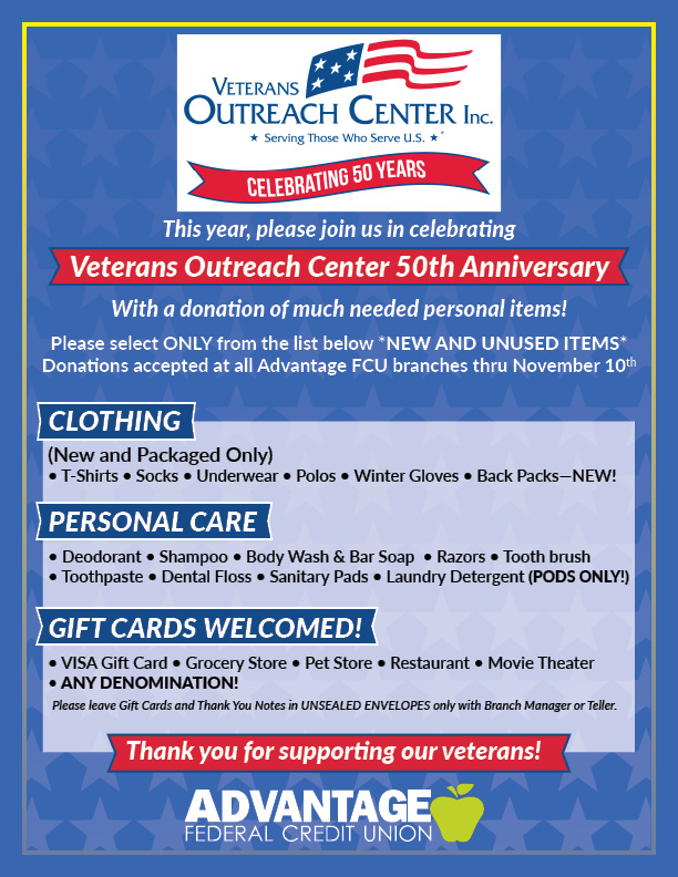 To celebrate the Veterans Outreach Center’s 50th Anniversary, Advantage is collecting Gift Cards and select personal care items at all local branches. New and unused items only (see flyer) can be dropped off in the donation bins at each branch. Gift Cards of any kind should be left with a branch representative. Please join us in this special campaign to honor our Veterans!
