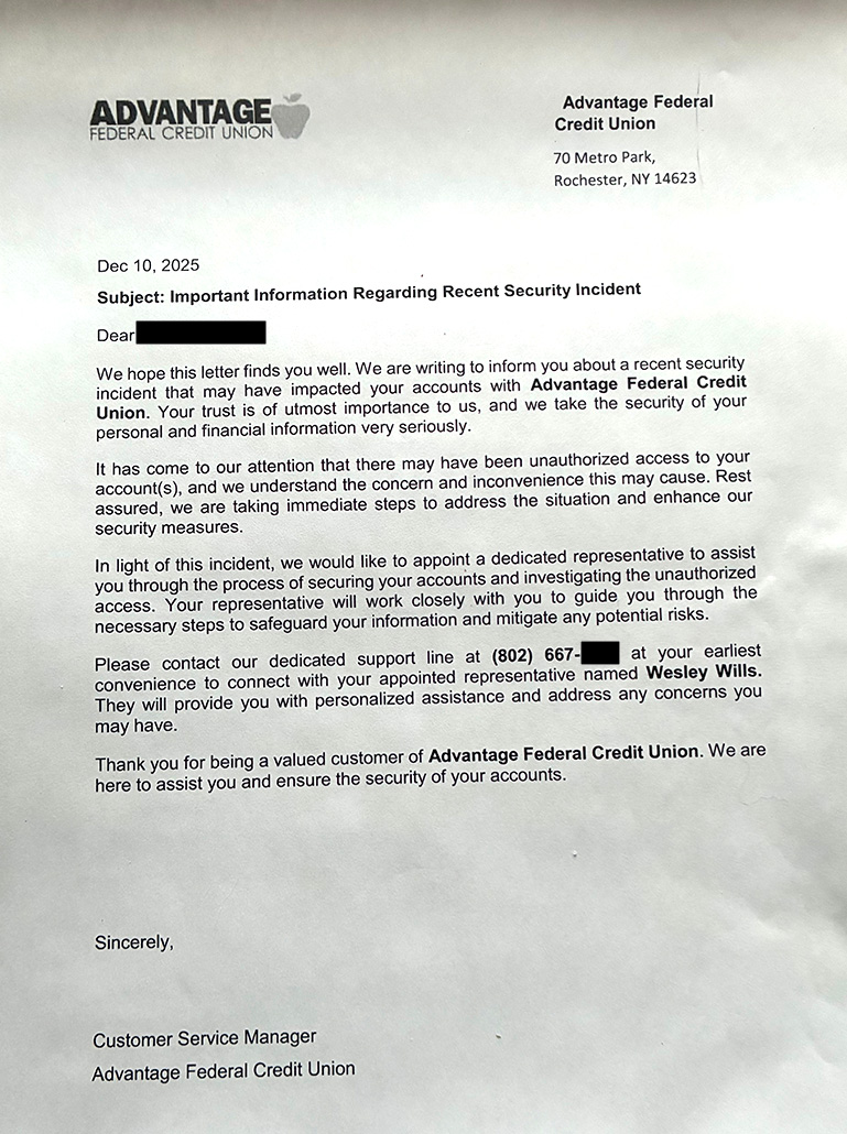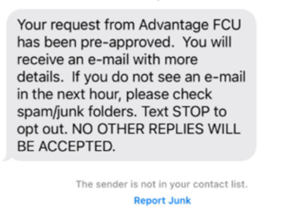 These are some examples of a fraudulent messages that some members have received. These are NOT from Advantage FCU. This is not our phone number, and this is not our Member Service Center. For any questions or confirmations always call our Member Service Center directly at 585.454.5900.